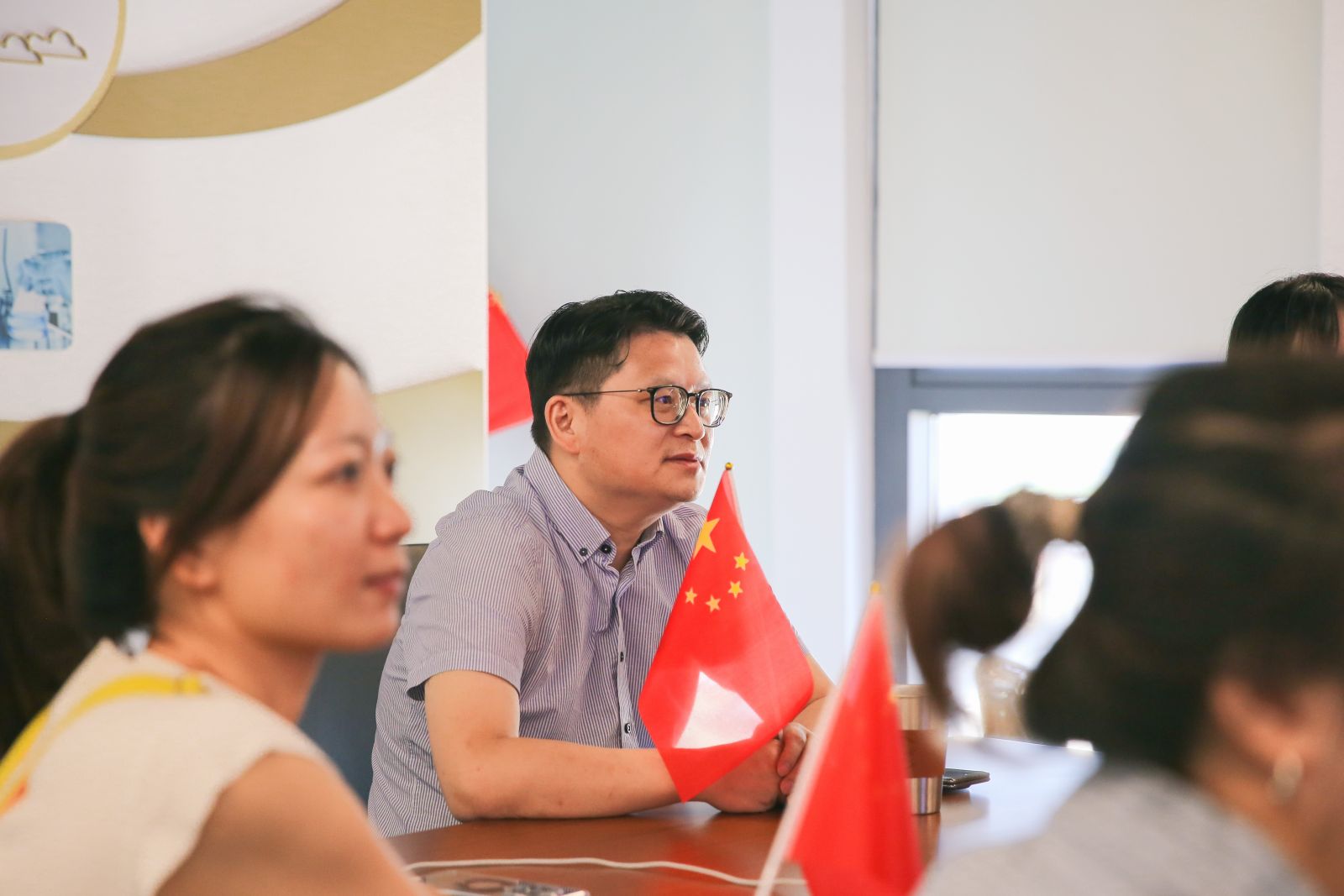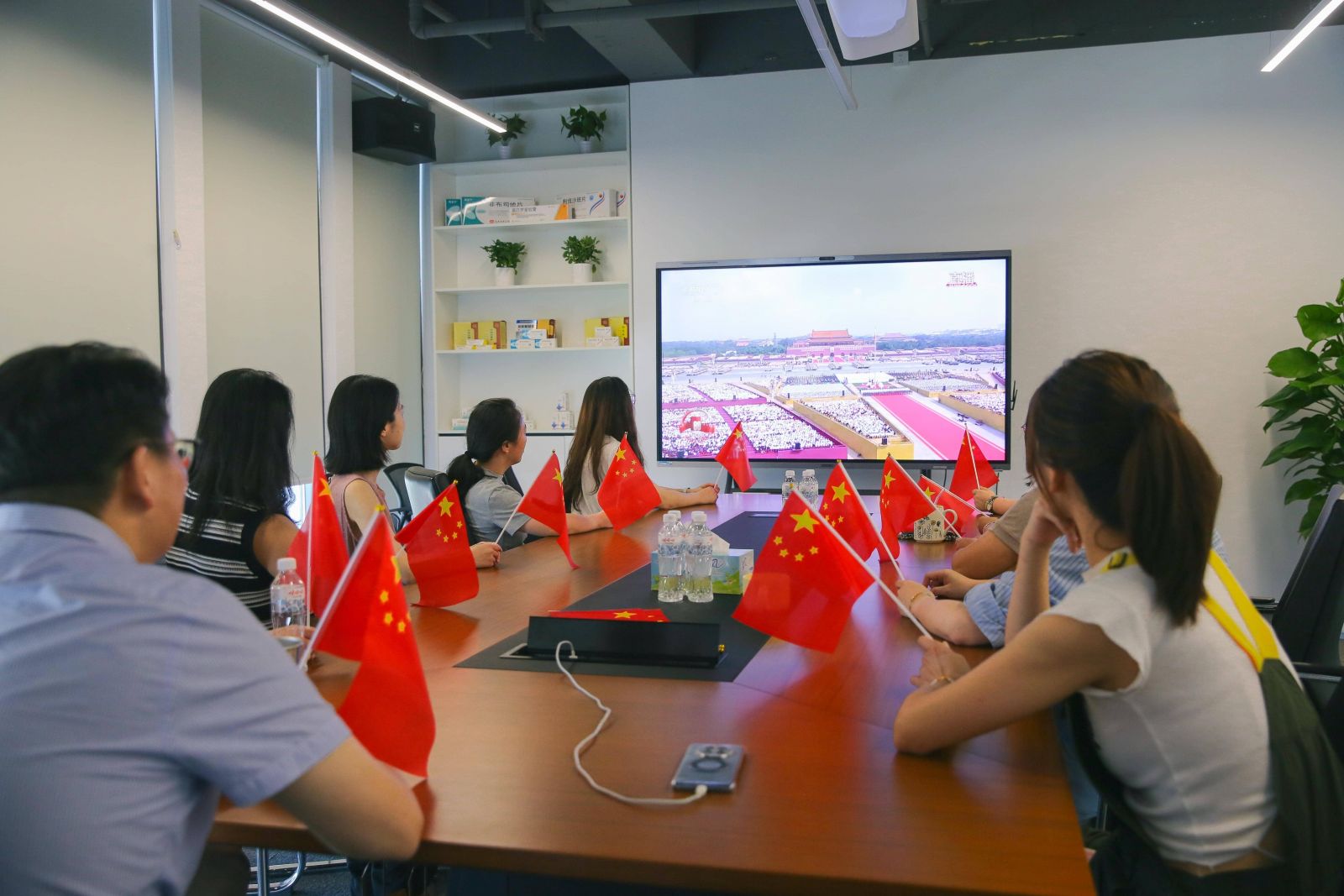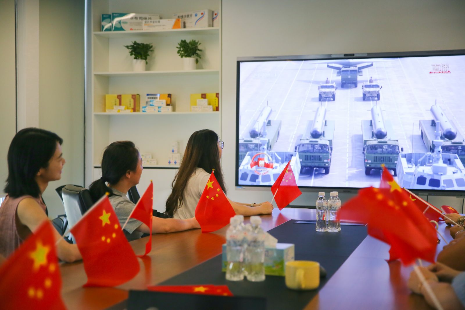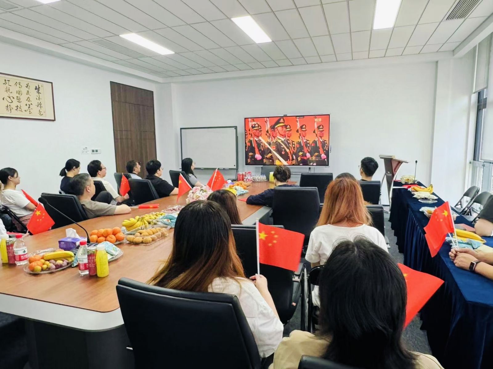 上午9时,公司会议室已座无虚席,现场洋溢着庄重而热烈的气氛。党支部提前为大家准备了手持小国旗,同志们手持国旗,满怀期待地等待仪式开始。当屏幕上出现雄伟的天安门广场、威武雄壮的受阅部队时,全场肃然起敬,所有人的目光都聚焦于展现国家实力与和平决心的历史性时刻。
